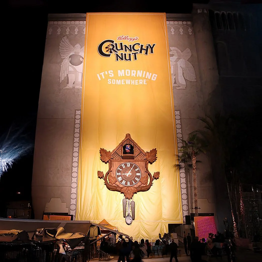 position ourselves as a cereal so good you won’t want to wait until morning to eat it. fortunately it’s morning somewhere. we brought “it’s morning somewhere” to life by building the world’s largest cuckoo clock in the middle of hollywood boulevard. for 24 straight hours, one comedian emerged from the clock every hour as a character from a place in the world where it was currently morning.