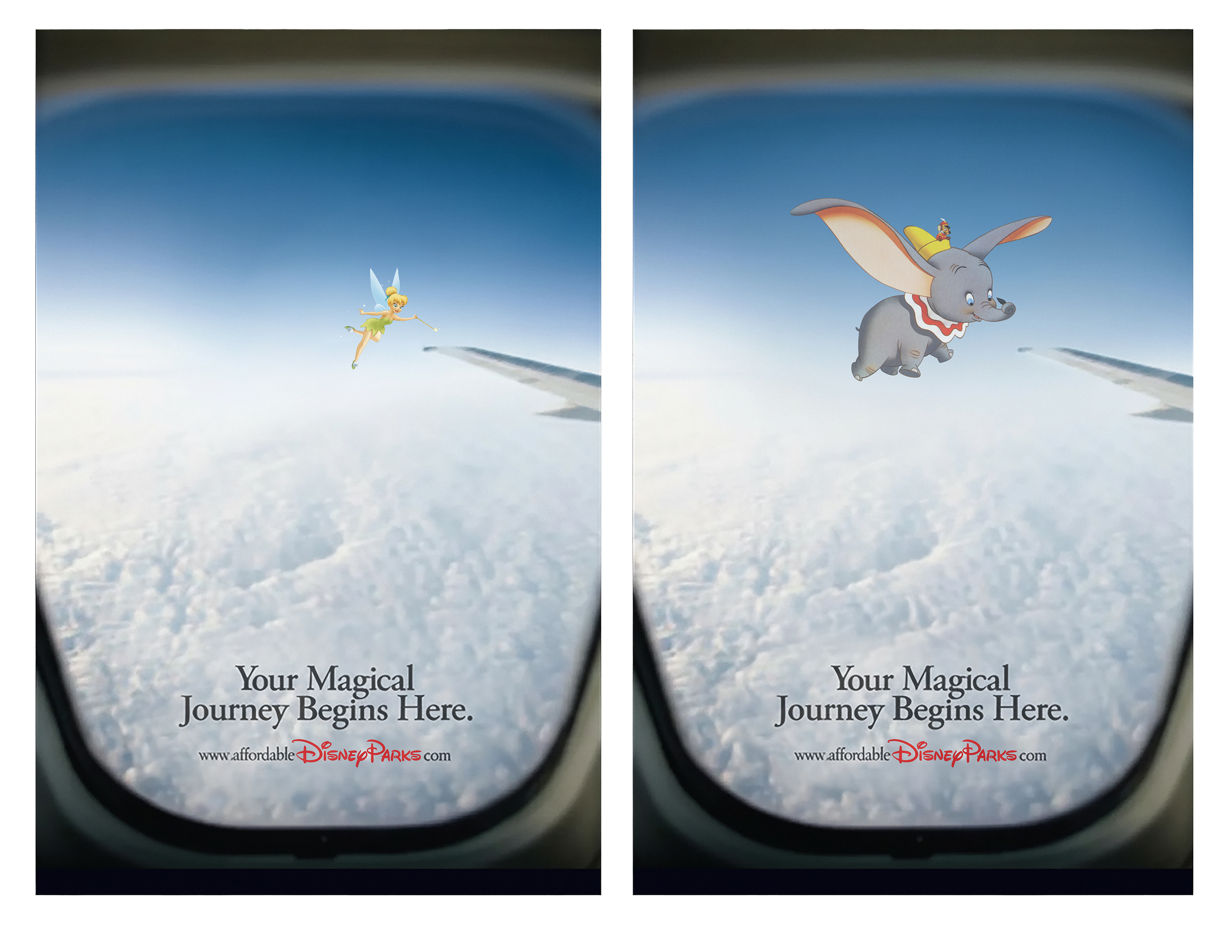 we created airport art for an audience looking for an affordable disney package. the creative included cinderella ball themed ticket envelopes, glass slippers on the baggage carousel, flying dumbo & tinker bell window clings, and “non-poisonous” apples for in-flight snacks.